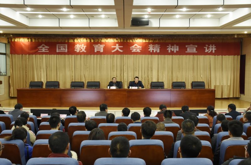 会上,俞子泓以《深入学习贯彻全国教育大会精神,切实加快我校应用技术大学建设步伐》为题,从“充分认识全国教育大会的重大意义”,“深入学习领会习近平总书记关于教育的重要论述”,“确保教育大会精神落实落地”,“以习近平总书记重要讲话和全国教育大会精神为根本遵循、奋力开创学校转型发展新局面”四个方面深入浅出,全面准确系统深入地宣讲了全国教育大会精神。